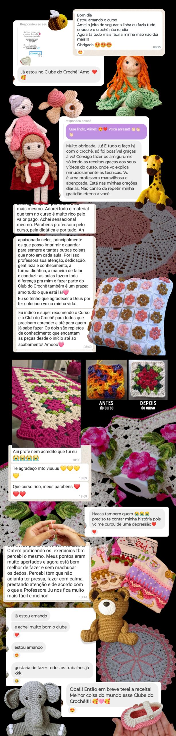 Obs.: Todas as aulas do Club são em vídeo passo a passo detalhadas feitas pela professora Ju da JNY Crochê que é professora de verdade e conta com mais de 10 anos de experiência, criadora de centenas de peças de crochê exclusivas e que já ajudou milhões de pessoas a aprender crochê.